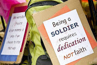“Estamos enviando un mensaje”, dijo Justin Griffith, sargento en Fort Bragg. “En las trincheras, los ateos luchan también por vuestros derechos. Por favor, devolvednos el favor”. En la concentración, convocada bajo el lema Rock Beyond Belief (un juego de palabras que significa ‘solidez más allá de la fe) se vio todo tipo de carteles, en los que se leían consignas como “ser soldado requiere dedicación, no fe” o “no hay capellanes en las trincheras”. Griffith la organizó, en parte, para protestar contra un evento de cristianos evangélicos en la base que, según su opinión, iba dirigida a convertir soldados al protestantismo.